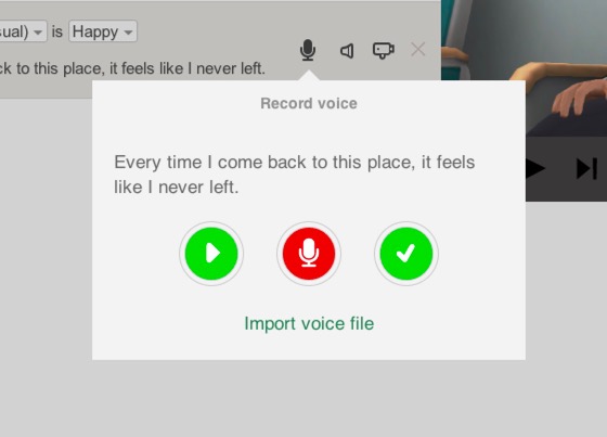 You can replace the digital voices with human voices, and Plotagon will automatically synchronize the characters’ lips with the sound of the recorded voice in any language. There are two ways to get dialogue recordings into the application: