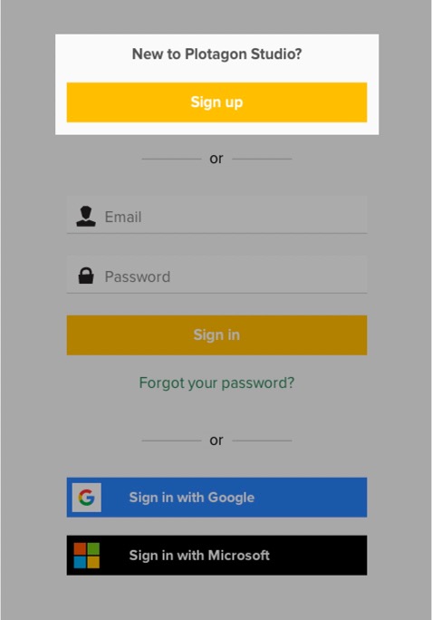 The first step is to create your account. You must have a valid email address in order to register. (Even if you plan to use your Google or Microsoft login, you must first create a Plotagon account.)
