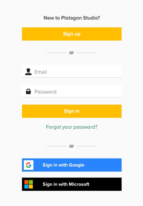 The next time you launch Plotagon Studio, simply enter your username and password (or choose the Google or Microsoft login option) to begin using the application.