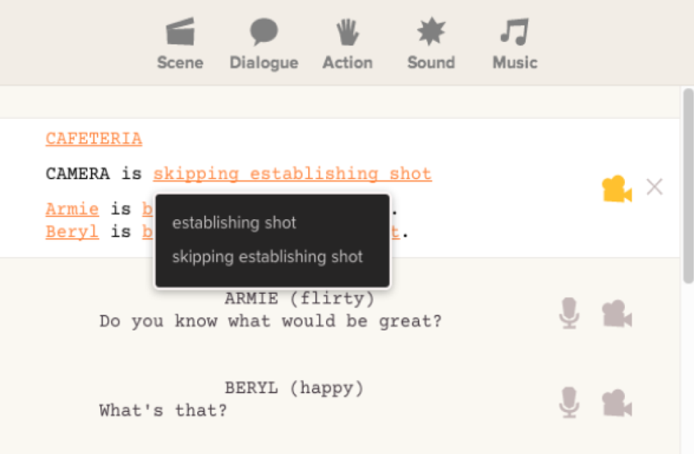 To remove this establishing shot, click the camera icon next to each scene and select “camera is skipping establishing shot”: