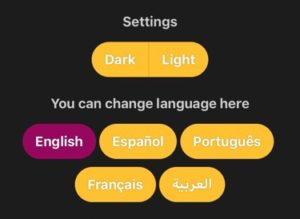 Click the Settings icon (the gear icon in the top-right hand corner of the screen) to change the User Interface language from English to another language, or switch from Dark Mode to Light Mode.